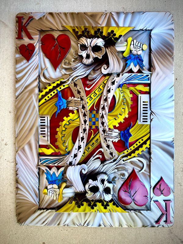 A design that depicts the King of Hearts, holding a sword behind his head, sometimes nicknamed the “Suicide King.”
