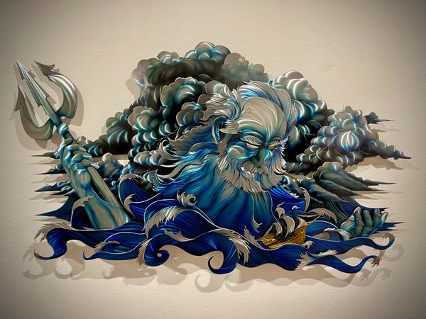 "In the Hands of Neptune" is a striking metal art sculpture that captures the essence of human fragility. The artwork depicts Neptune, the god of the sea, emerging from turbulent waters, his powerful hands holding a single, helpless ship. Through this poignant imagery, the sculpture invites viewers to contemplate the delicate nature of our existence and the overwhelming forces that can shape our lives.