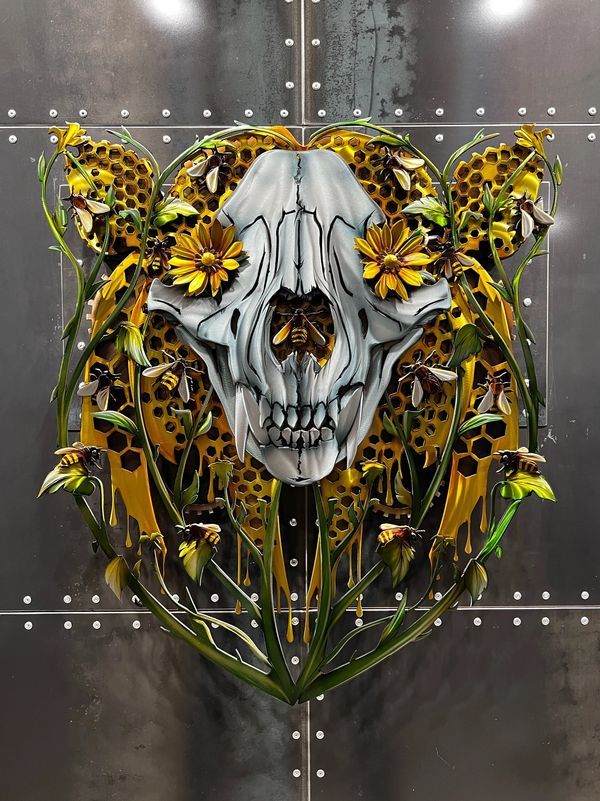 The centerpiece of the artwork is a bear skull, symbolizing strength and resilience, adorned with vibrant sunflowers delicately placed in its eye sockets, representing the cycle of life and the beauty that emerges even in the face of death. Surrounding the bear skull are meticulously crafted honeycombs, forming the overall shape of a bear's head, symbolizing the harmony and interconnectedness of nature. These honeycombs serve as a reminder of the sweetness and richness of life, as well as the importance of preservation and balance in the natural world. Completing the composition are honey bees buzzing around, their presence emphasizing the vital role of pollinators in sustaining life and highlighting the significance of their symbiotic relationship with sunflowers and honeycombs.